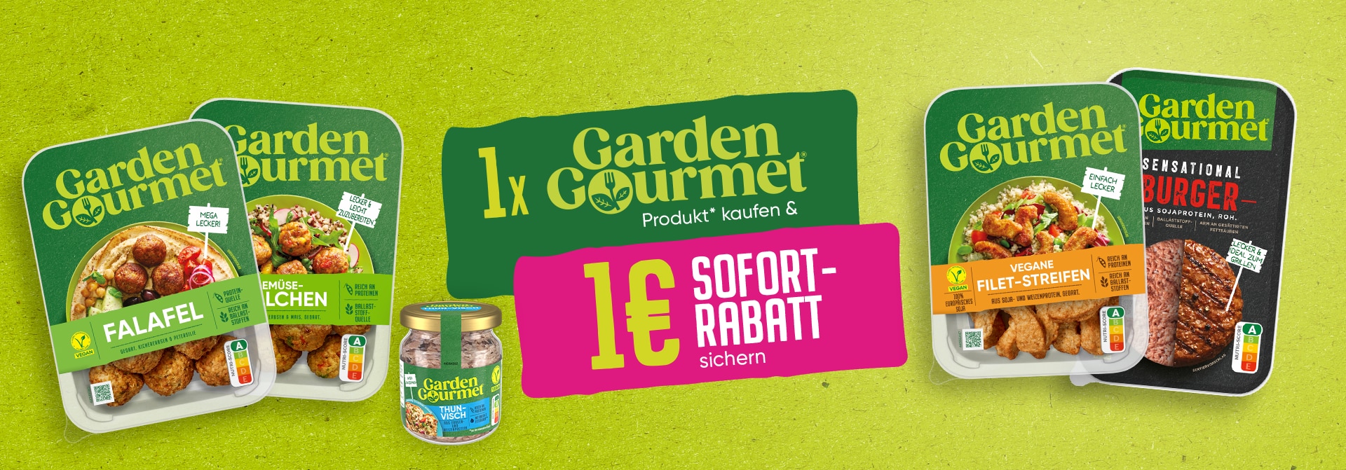 Sichere dir beim Kauf eines Garden Gourmet Produkts mit dem Original-Coupon einen Sofort-Rabatt von 1 € an der Kasse! Die Coupons findest du bei ausgewählten teilnehmenden Handelspartnern bei unseren Garden-Gourmet Produkten im Kühlregal. Bitte habe Verständnis, dass die Coupons nicht in jedem Markt verfügbar sind. Der Coupon ist gültig vom 02. März bis zum 02. August 2026. Einfach einen Coupon vom Couponblock abtrennen, ein beliebiges Garden Gourmet Produkt (ausgenommen die Garden Gourmet Pizza-Varianten) kaufen, den Coupon beim Bezahlen an der Kasse vorlegen und 1 € Rabatt sichern!