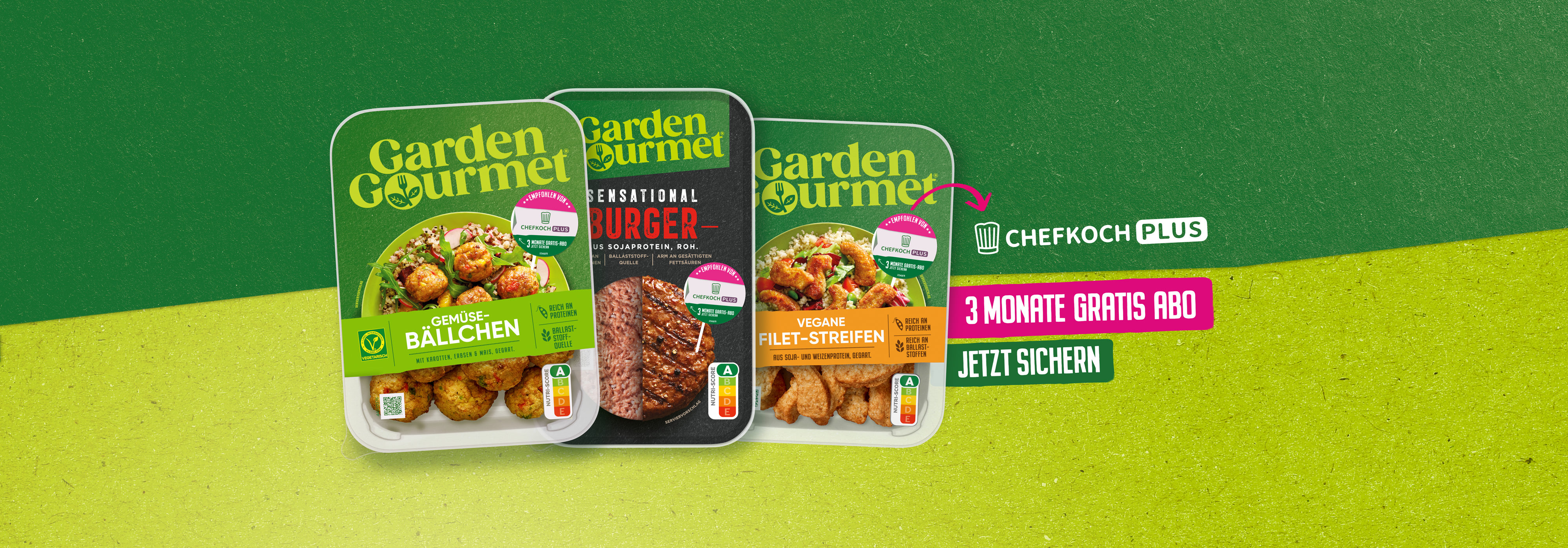 Geschmacksexplosion trifft Rezept-Revolution! Ab sofort wird dein Einkauf zum kulinarischen Upgrade: Auf ausgewählten Garden Gourmet Produkten wie den beliebten Gemüsebällchen, Filet-Streifen oder dem Sensational Burger findest du jetzt einen knalligen Sticker – und der hat’s in sich! Denn damit kannst du dir ein kostenloses 3-Monats-Abo von Chefkoch PLUS* sichern. Ja, richtig gehört: 3 Monate grenzenloser Zugang zum Premium Abo der größten Rezeptwelt Europas.