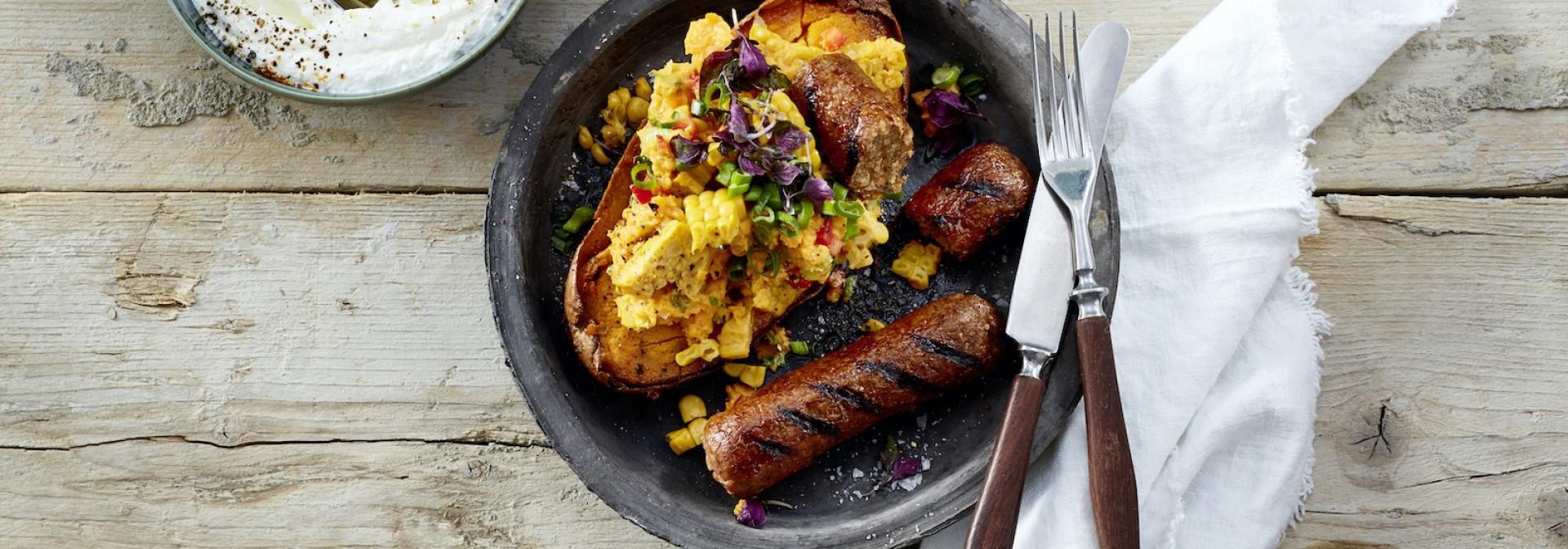 Unser leckeres Rezept mit gebackener Süßkartoffel und veganer Garden Gourmet Sensational Bratwurst führt dich auf eine kulinarische Reise nach Mexiko. Probier´s aus!