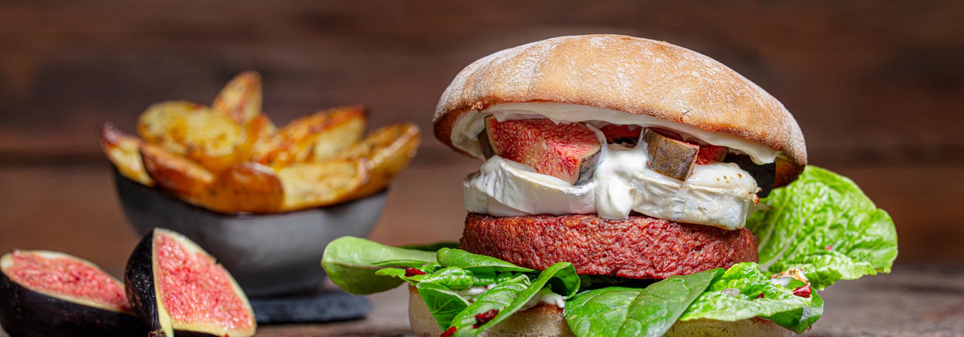 Vegetarischer Burger mit Ziegenkäse, Honig, Feige und Wildkräutersalat